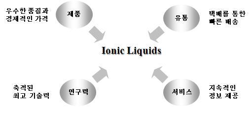 √ 2000~2001년: 창업기[이온성 액체 생산 및 국내 판매시작 √ 2001~2003년: 성장기[국책과제수행 및 국외 판매시작] [Merck, Lancaster등] 해외수출 √ 2003~2007년: 도약기[사업확대 및 공동 국책과제수행] 2005 Japan CPhI, 2007 China CPhI 참가 기술력인정[2004 대한민국 기술대전 금상수상 |